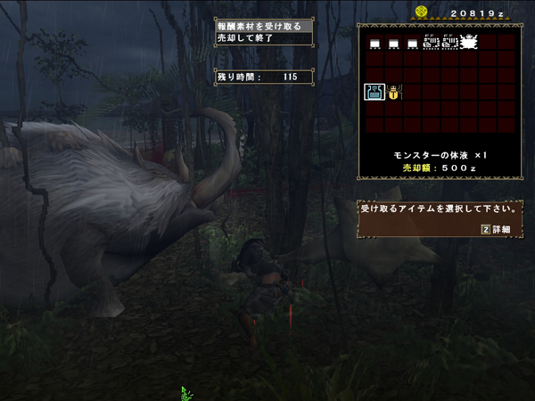 クロとりぅ~がこっちのワールドに来るまで、アタシの武器強化に必要なモンスターの体液集めへ~。